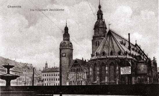 Wie die Sage erzählt, habe Kaiser Otto der Große im Jahre 938 da, wo die Jacobikirche steht, eine Kapelle errichten lassen und in den Grundstein eine Münze mit dem Bild des heiligen Jacobus gelegt. In der Kapelle war ein Marienbild aufgestellt, dem man wundertätiges Wirken zusprach. Dadurch bekam dieses Kirchlein großen Zulauf hilfesuchender Christen. Kurz vor 1143 wurde an der Stelle der Kapelle die Stadt- oder Marktkirche als romanische Saalkirche gebaut. Einer anderen Sage ist zu entnehmen, daß der Bauplatz moorig gewesen sei. Das Bauvorhaben erforderte deshalb, starke Pfähle in den Boden zu rammen. Dem Baumeister müssen aber hinsichtlich der Standfestigkeit des Gebäudes vermutlich Zweifel aufgekommen sein. Nach Vollendung des Baues soll er sich von oben herabgestürzt und somit diesen mit seinem Blut versiegelt haben. Ehrwürdigen Alters - man nannte sie wohl schon im 12. Jahrhundert erhebt sie sich am Markt hinter dem Rathaus, die früher auch Markt-, Haupt- oder Pfarrkirche genannt wurde. Sie stand in Patronatsbeziehung ursprünglich zu dem Benediktinerkloster auf dem Schloßberg. Sie teilte Leid und Freude der sich ausbreitenden Stadt, sie sah viel Großes und Schweres, ihre Glocken riefen vielen zur letzten Rast, zum Ausruhen in ihrem Gottesackerfrieden, sie sah vielmals Brand aufleuchten und Haus und Straße, ja manches Stadtviertel in Schutt legen. Ihre Orgel brauste Freunden und auch Feinden, mancher gelehrte, redekundige Pfarrherr kündete der andächtigen Menge die Herrlichkeit Gottes oder getröstete die Verzagten, wilde Soldateska hauste in ihren Mauern, und vom hohen Turme schaute der besorgte Bürger hinaus auf den Feind. Zwischen 1350 und 1365 erfolgte der Neubau als dreischiffige Hallenkirche mit hochgotischem Kreuzgewölbe. Durch Stadtbrände 1389 und 1395 teils stark zerstört, wurde sie neu errichtet, diesmal im spätgotischen Stil mit dreischiffigem Langhaus. Beim Brand am 5. November 1677 stürzte der Turm ein, ein neuer kam 1878 bis auf 60 m Höhe zur Ausführung. Als in den siebziger Jahren des vergangenen Jahrhunderts die Baufälligkeit des Gotteshauses immer mehr zutage trat, ging man 1877 bis 1880 an eine vollkommene Erneuerung des Baues, die nach den Plänen des Kirchenbaumeisters Altendorff durchgeführt wurde. Die Hauptveränderungen bestanden in dem Wegreißen der entstellenden Anbauten, in der Erneuerung der Stirnseiten im gothischen Geschmack, in der Errichtung eines reich verzierten Westgiebels über der kreuzgewölbten Vorhalle, an dem die von Bildhauer Haendlers Meisterhand geschaffenen Apostelstandbilder angebracht wurden. Der früher freistehende, nicht im gothischen Geschmack gebaute Glockenturm von 60 m Höhe, der auf Pfahlrost steht und schon vor 1333 genannt ist, wurde zu einem Kirchenganzen durch einen 1885 errichteten Schwibbogen mit dem Hauptgebäude verbunden. Die vier Glocken klingen B D F B. Natürlich erfuhr auch das Innere der Kirche manche Umgestaltungen. Alt sind die mächtigen Pfeiler, die in einem rippengezierten Kreuzgewölbe zusammengreifen, alt ist auch das unter den Chorfenstern hinlaufende Maßwerk. Der reich geschnitzte Hochaltar, aus der Fabrik von Kühn in Altenburg wurde neu geschaffen, gleichfalls der von der Chemnitzer Firma Morgenstern & Schmidt hergestellte und gestiftete Taufstein, endlich die Kirchenfenster. Die Erneuerung im Jahre 1900 wurde durch die von den Herren Stadtbaurat Möbius und Oberbaurat Professor Gottschaldt geleitet. Gestühl und Emporen erhielten einen tiefrotbraunen Anstrich, reiche Vergoldung wurde an Altar, Orgel und Kanzel angebracht. Auch die Beleuchtungskörper wurden für Gasglühlicht eingerichtet, zum größten Teile aber ganz neu beschafft. Die Orgel, mit 62 klingenden Stimmen, 1888 von Friedrich Ladegast in Weißenfels neu erbaut, wurde 1903 für 5.000 Mark. mit einer Orgelpneumatik nach neuesten Grundsätzen und 1905 mit elektrischem Antrieb versehen. Der Westgiebel erhielt 1911/12 die heutige Gestalt mit Skulpturen der Apostel Jacobus, Johannes, Paulus und Petrus. Im Inneren verfügt der Sakralbau über das zwischen 1480 und 1485 geschaffene Heilige Grab und besaß den um 1504 geweihten, 1792 abgebrochenen Hochaltar. Aus der Kreuzigungsgruppe im Aufsatz des Hochaltars stammt die von Hans Witten 1504 geschnitzte Schmerzensmutter, eine spätgotische Plastik. In der Gruft der Kirche wurden beigesetzt: Abt Huanus von Rehburg; Superintendent Fues; Geistliche und Ratspersonen sowie im Dreißigjährigen Krieg und nach dem Siebenjährigen Krieg hier verstorbene Offiziere. Seit 1879 ist die Gruft zugemauert. Im Zweiten Weltkrieg brannte das Kirchenschiff aus, und das Dach stürzte stellenweise ein. Eine Wand trennt nunmehr den erhaltenen Chor von der Ruine des Kirchenschiffes, um dessen Wiederherstellung Bemühen sichtbar ist. |